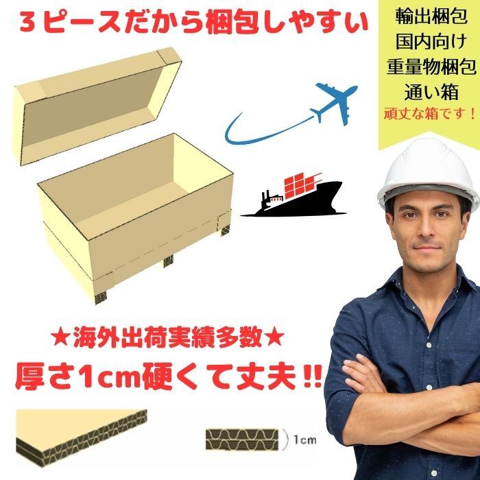 ダンボールなので重さも軽く、扱いやすいです。輸出梱包に使えるだけでなく、通い箱にもぴったり。場所を取らず、使い回しもできるので、コストダウンにもなります。