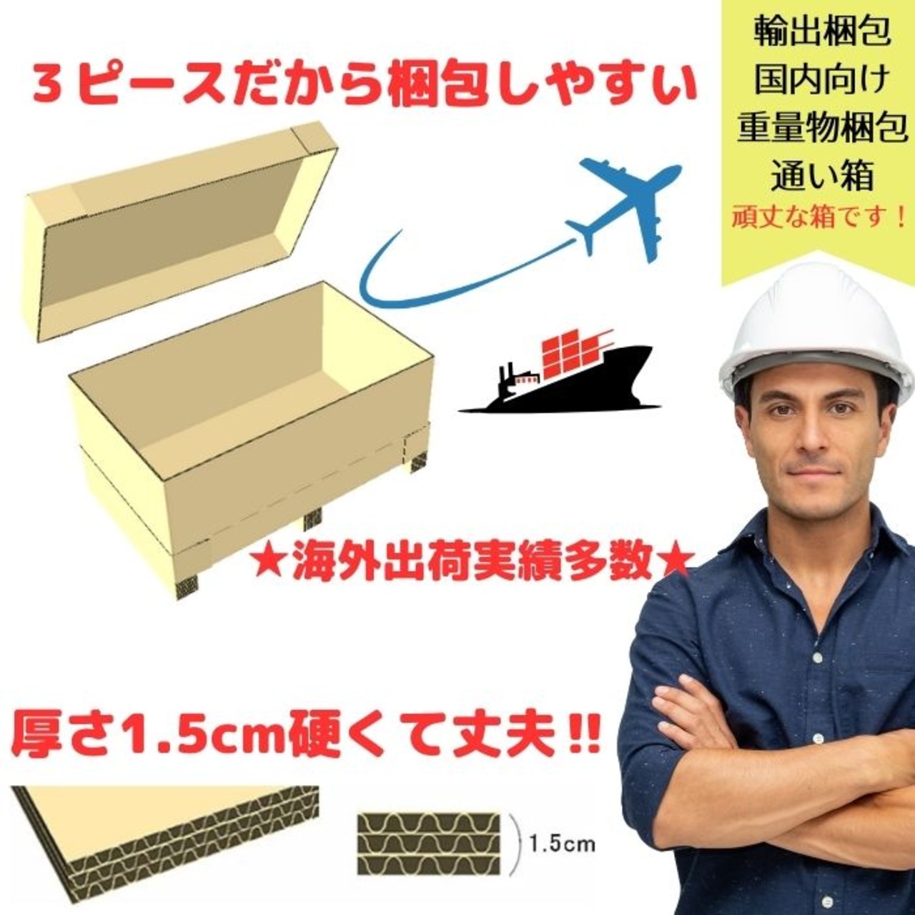 ダンボールなので重さも軽く、扱いやすいです。輸出梱包に使えるだけでなく、通い箱にもぴったり。場所を取らず、使い回しもできるので、コストダウンにもなります。