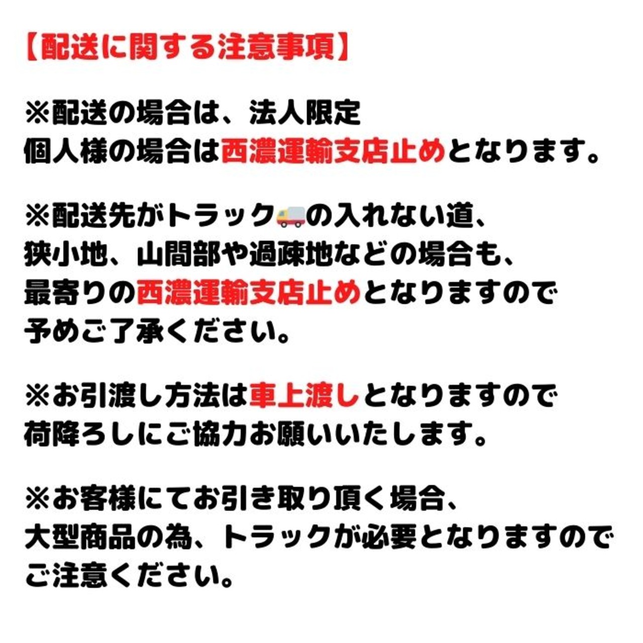 ※トラックの入れない道、山間部、過疎地等も運送会社支店止めとなります。