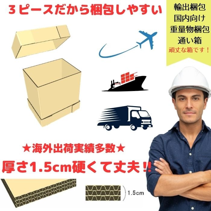 小ロットから購入可能な強化ダンボール箱です。精密機器、医療機器、分析機器や半導体関連・電子パーツ、モーターなどの輸出に使用されたり、美術品・模型などにもご利用頂いた事もございます。木箱や木枠の代替品としても使えます。